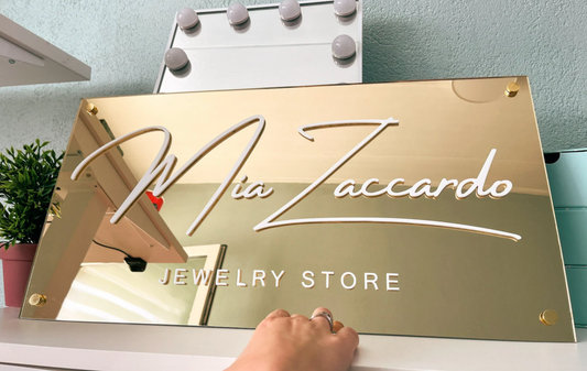 targa ln plexiglas ORO specchiato con logo insegna personalizzata per negozio locale moderno