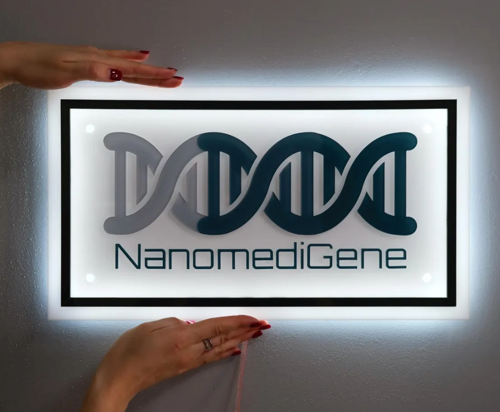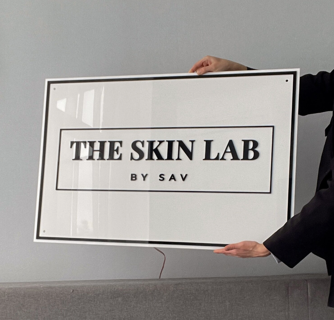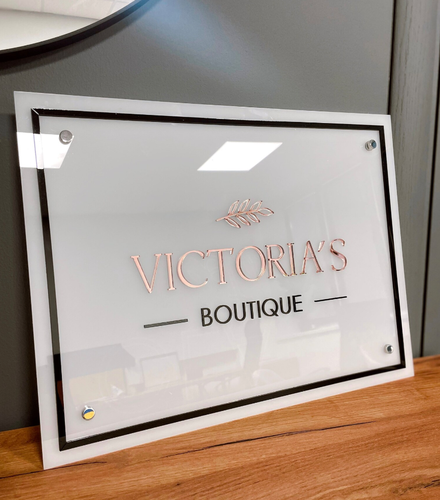 Aggiungi un tocco di raffinatezza alla tua attività con la nostra insegna retroilluminata in acrilico. L'acrilico satinato abbinato al logo dorato e alle lettere a specchio crea un look elegante e moderno. Illumina il tuo marchio e attira l'attenzione con questo segno accattivante.